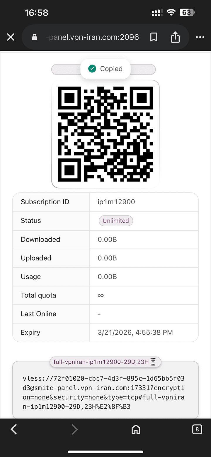 7- همچنین QR Code قرار داده شده که با اسکن آن، کانفیگ بهصورت خودکار ایمپورت میشود.